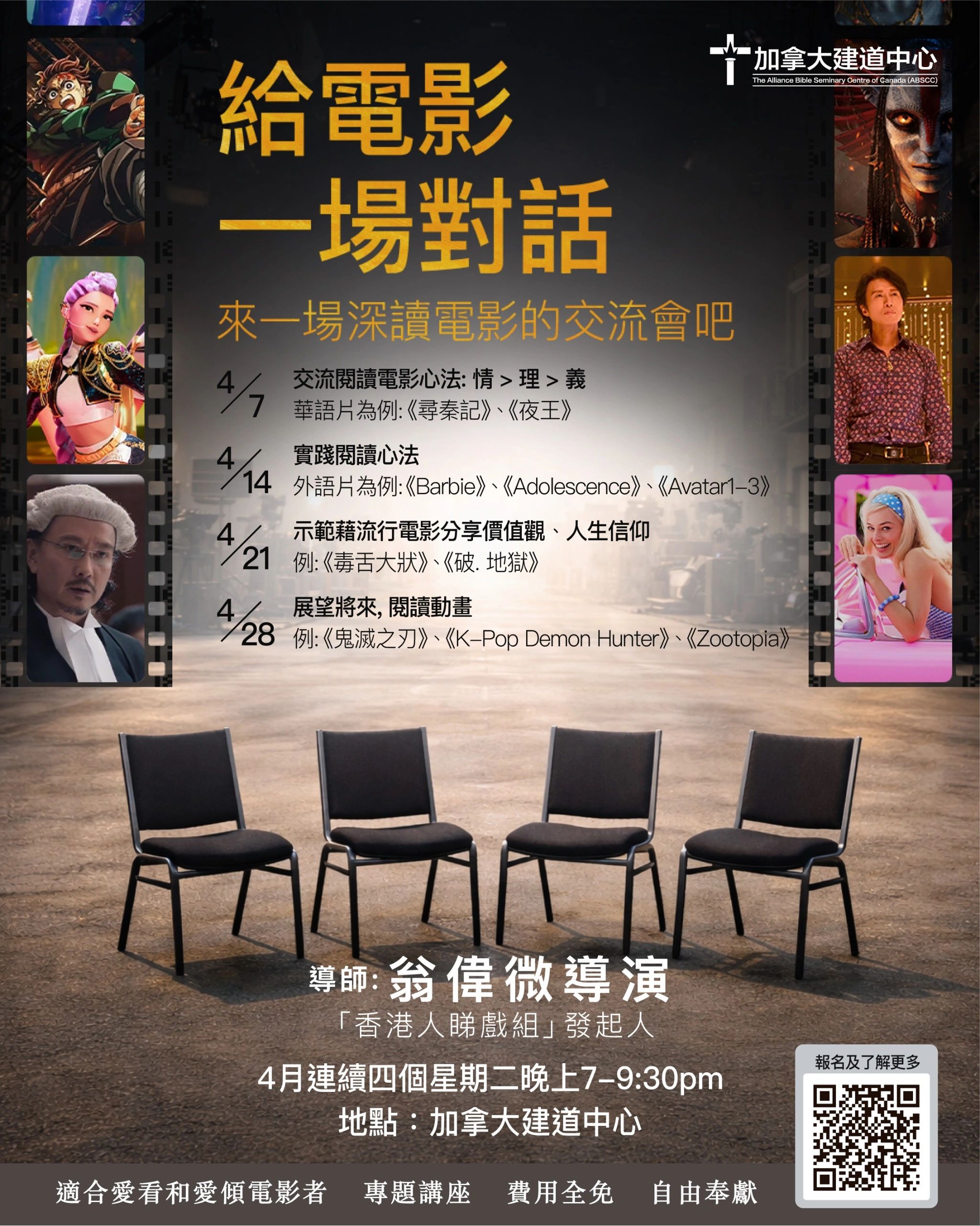 翁導於香港大學攻讀英國與比較文學和教育, 美國惠頓Wheaton大學 傳播及神學碩士; 曾執導港台電視戲劇節目《獅子山下》、《性本善》、《小說家族》、《完全學生手冊》、《女人多自在》等, 作品都在美國紐約和芝加哥獲獎, 也有拍攝大電影《當C遇上G7》(亞洲電影節)、《最後一支蠟筆》(FilmFEST; Accolade Competition) ,也曾在浸大﹑中大﹑理工﹑城大﹑教育大學等講授電影閱讀, 今次在多倫多公開介紹閱讀電影心法, 更談到藉電影與別人談人生信仰, 不容錯過!