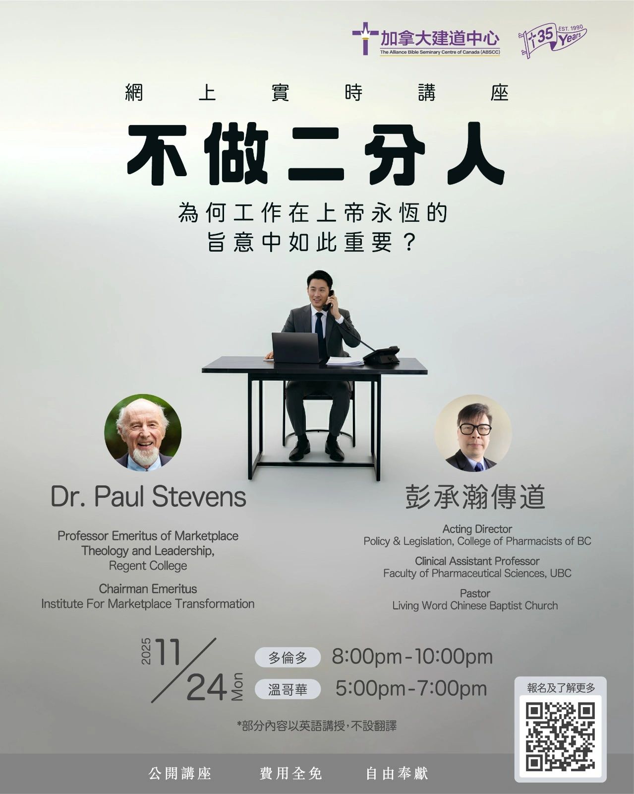 講座題目: 不做二分人-- 為何工作在上帝永恆的旨意中如此重要?
